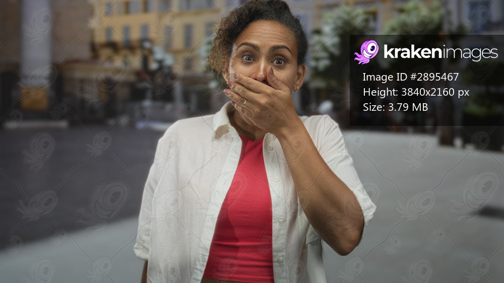 Woman covers mouth with hand and gives thumbs up on urban street near building facade wearing white shirt and red top; surprise approval reaction.