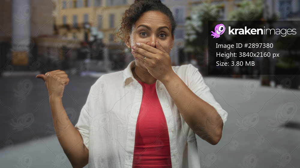 Woman covers mouth with hand and gives thumbs up on urban street near building facade wearing white shirt and red top; surprise approval reaction.