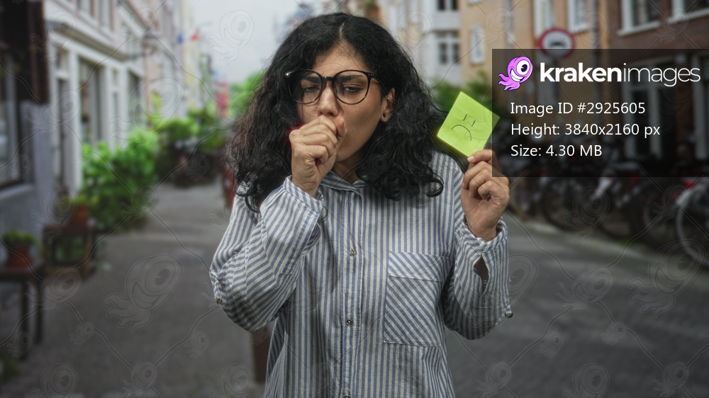 Woman covers mouth with hand holding sad sticky note on city street near bicycles; sadness isolation.