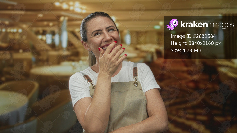 Woman covers mouth with hand in building interior near table under warm lighting; joy spontaneity.