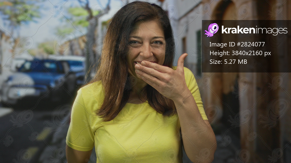 Woman covers mouth with hand on a sunlit city street lined with vintage cars and old stone buildings; silence.