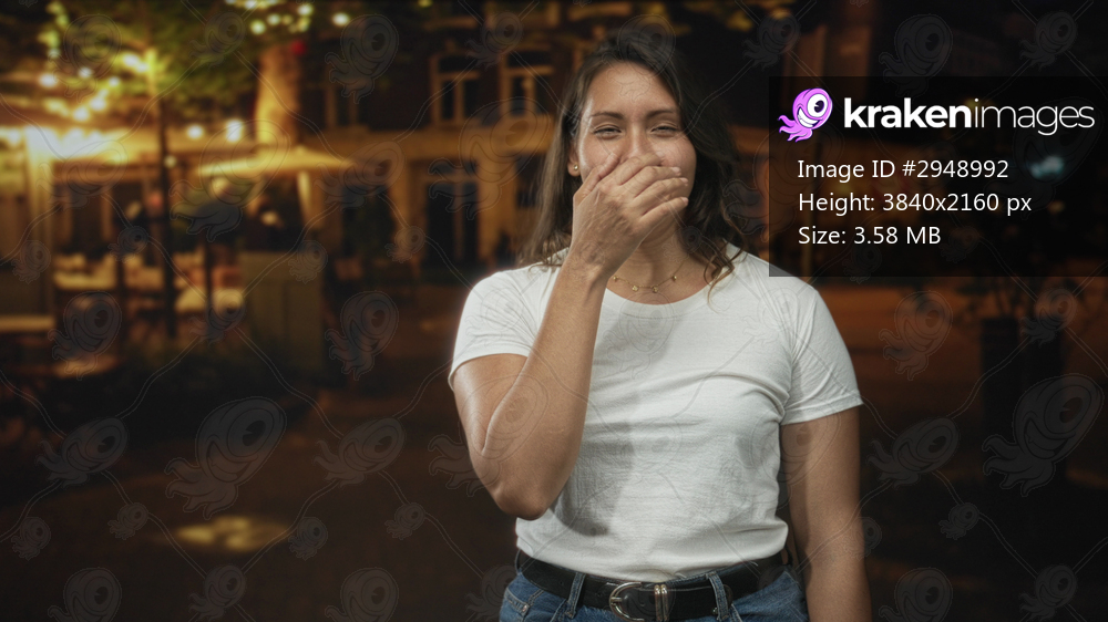 Woman covers mouth with hand on city street at night under warm lights, smiling with closed eyes; joy laughter.