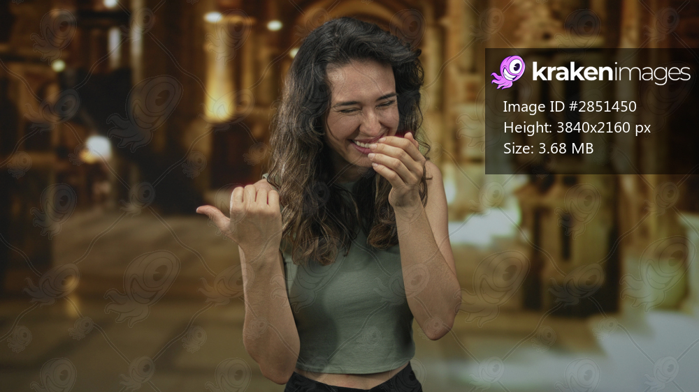 Woman covers mouth with hand and points thumb behind her in church building while wearing green top; amusement.