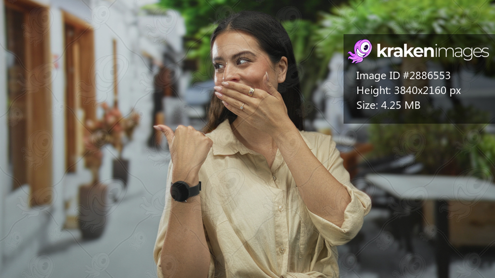 Woman covers mouth with hand and points thumb to chest on street outside cafe, wearing beige shirt and smartwatch; surprise.