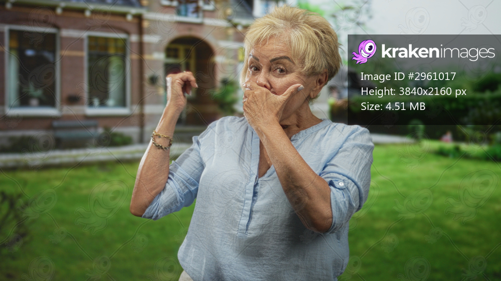 Woman covers mouth with hand and raises other hand in a front yard beside a brick building, wearing blue blouse and bracelet; surprise reaction.