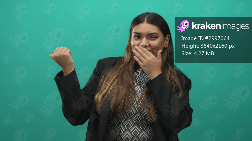 Woman covers mouth with hand while gesturing thumb back toward unseen object and stands before a green studio backdrop; playful surprise.