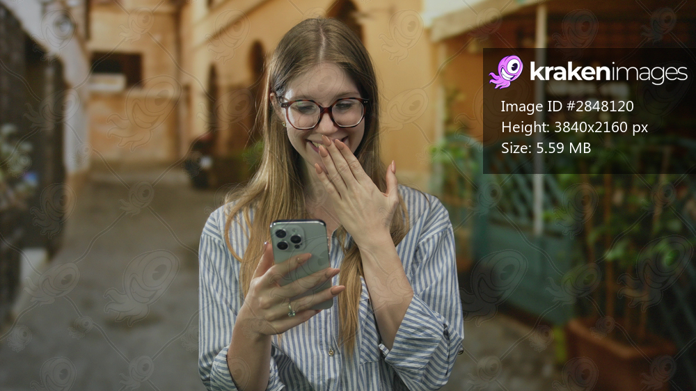 Woman covers mouth with hand while looking at smartphone screen on a sunlit old town street; surprise.