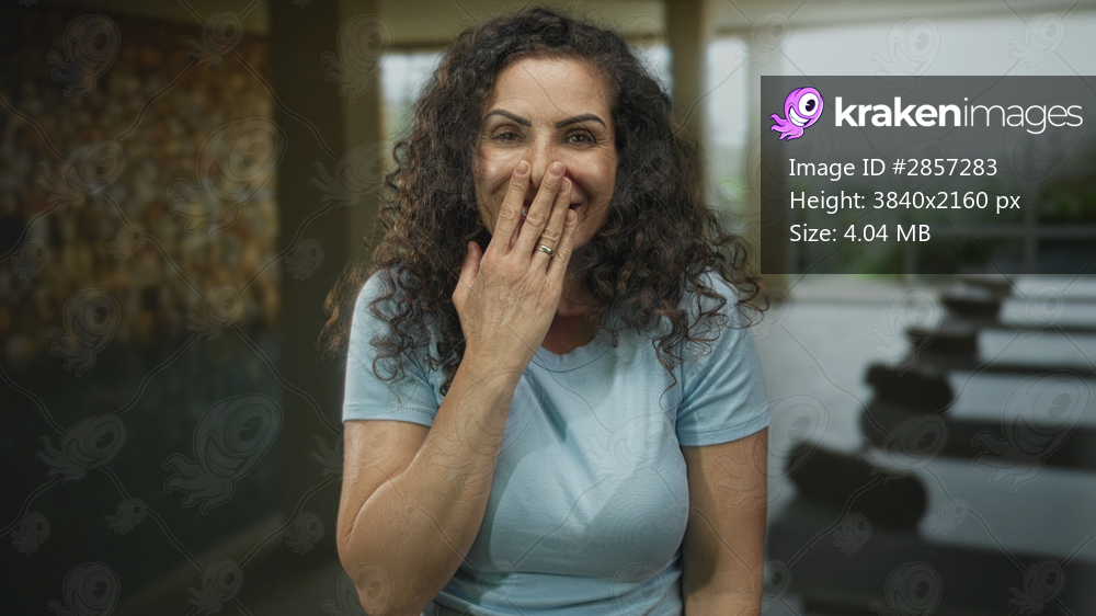 Woman covers mouth with hand while standing in spa pool building with floor to ceiling windows and lounge benches; surprise.