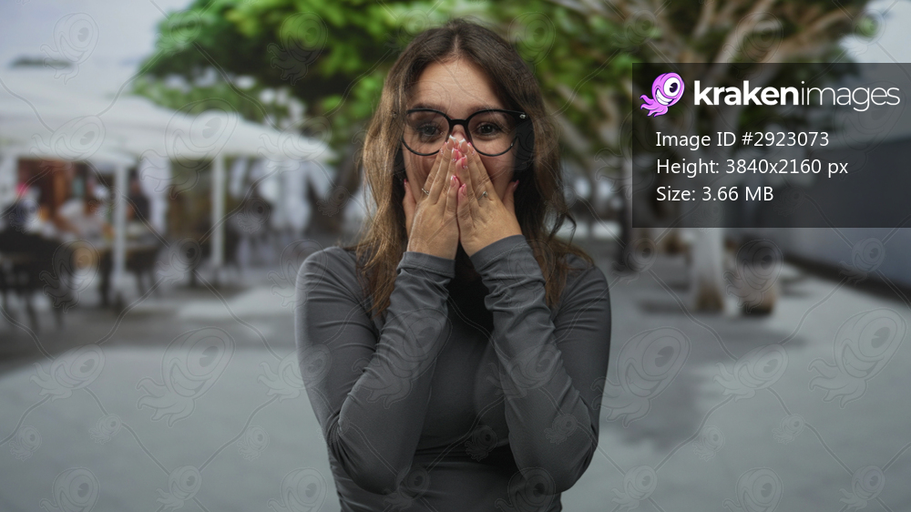 Woman covers mouth with hands and glasses on urban street near cafe trees, long sleeves visible; surprise reaction.