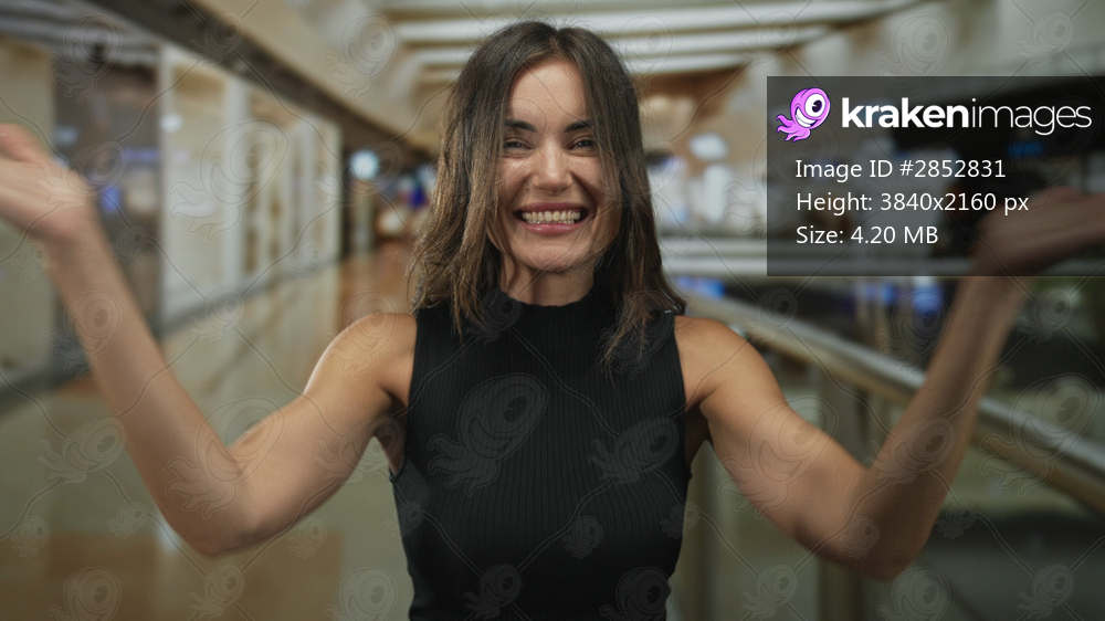 Woman covers mouth with hands in a building lined with retail storefronts and polished floor; surprise.