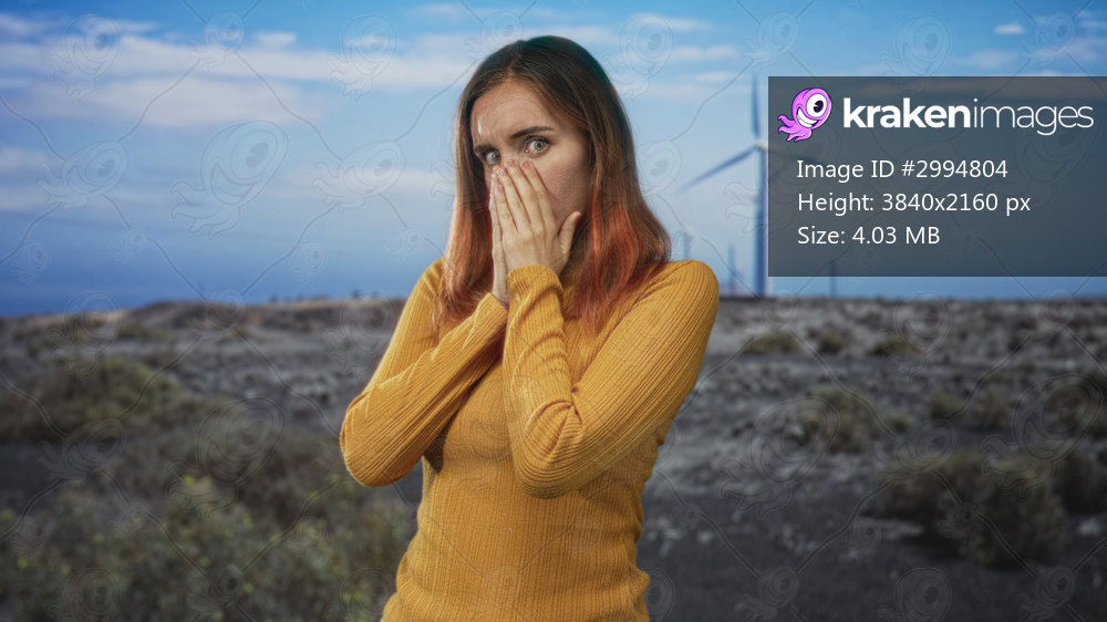 Woman covers mouth with hands in a mustard sweater in a studio scene with wind turbines and scrubland visible; anxiety isolation.