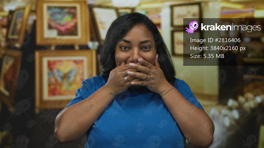 Woman covers mouth with hands in building filled with framed paintings and artwork on display walls; amazement.
