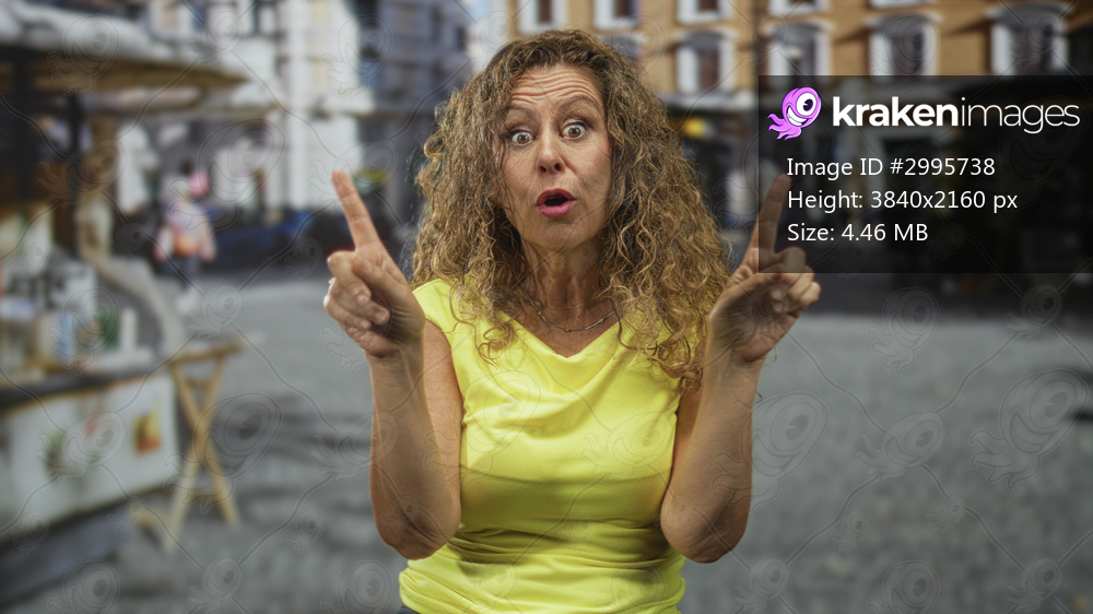 Woman covers mouth with hands in cobblestone street market beside stall, yellow shirt and curly hair framing face; surprise curiosity.