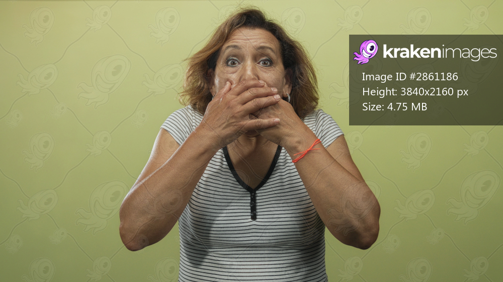 Woman covers mouth with hands in studio with pale green wall and striped shirt visible; surprise silence.