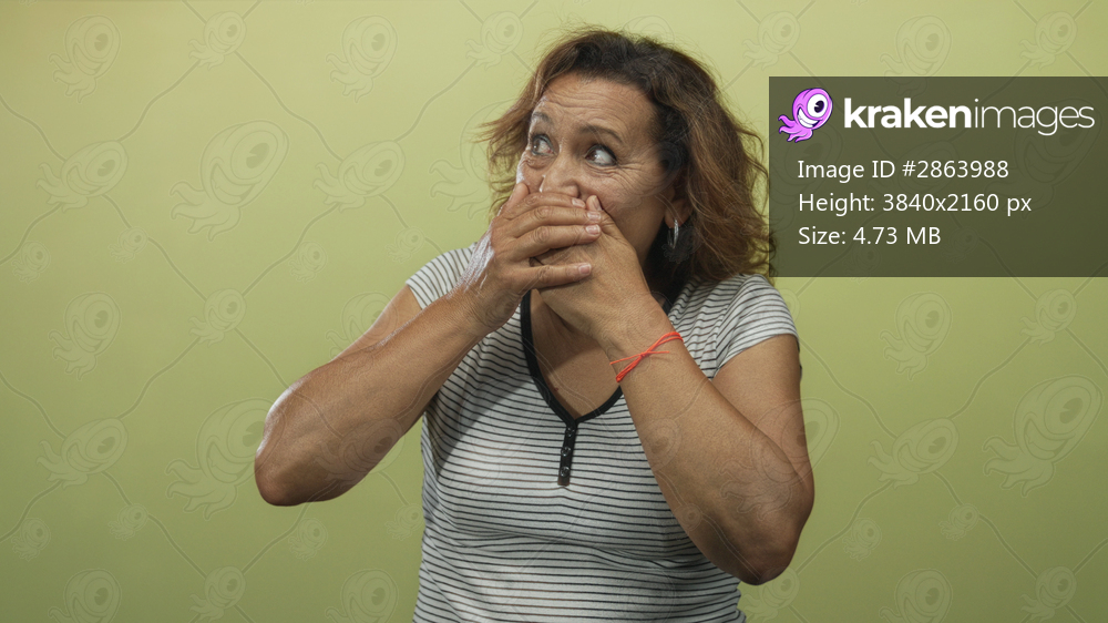 Woman covers mouth with hands in studio with pale green wall and striped shirt visible; surprise silence.