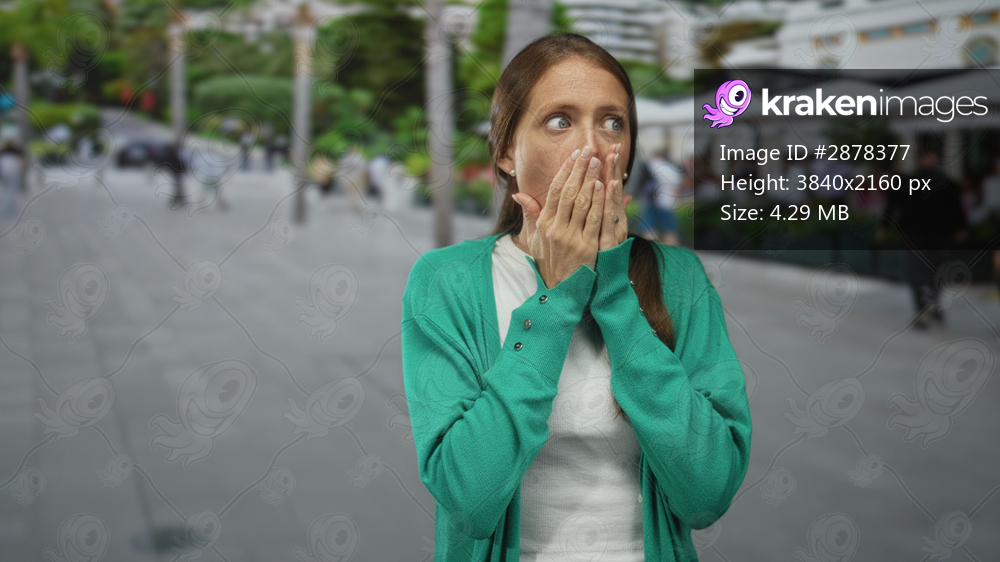 Woman covers mouth with hands on a crowded city street near outdoor cafes and passing pedestrians; public surprise reaction.