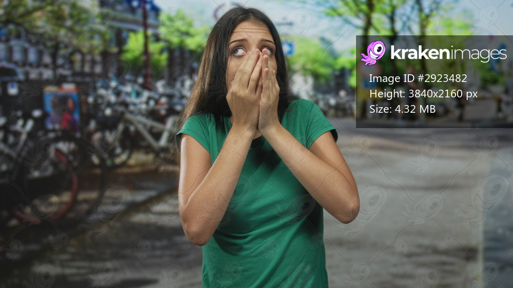 Woman covers mouth with hands on busy city street beside parked bicycles, wearing green tee; surprise.
