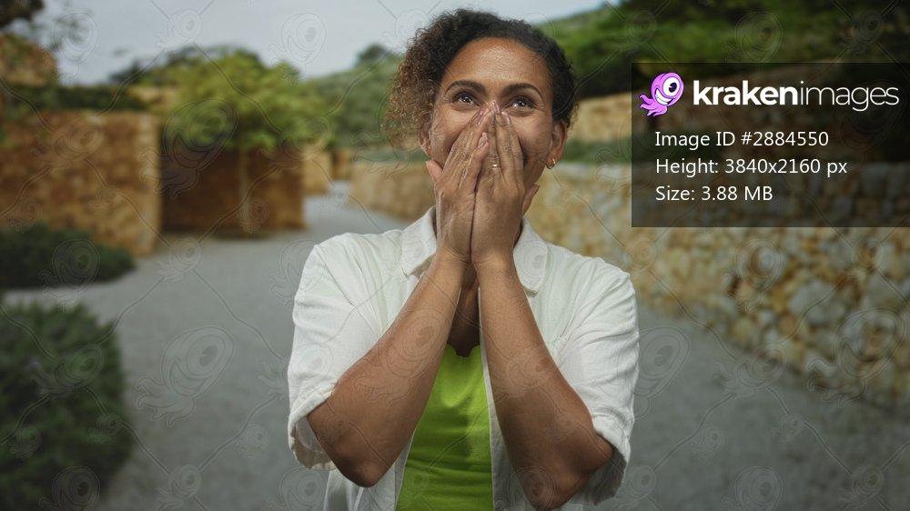 Woman covers mouth with hands on stone street walkway, smiling with bare hands showing ring and earring; surprise.