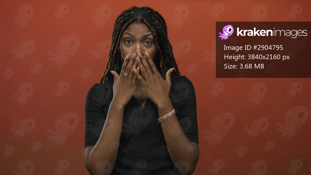 Woman covers mouth with hands showing ring and bracelet and braided hair in orange studio; surprise vulnerability.