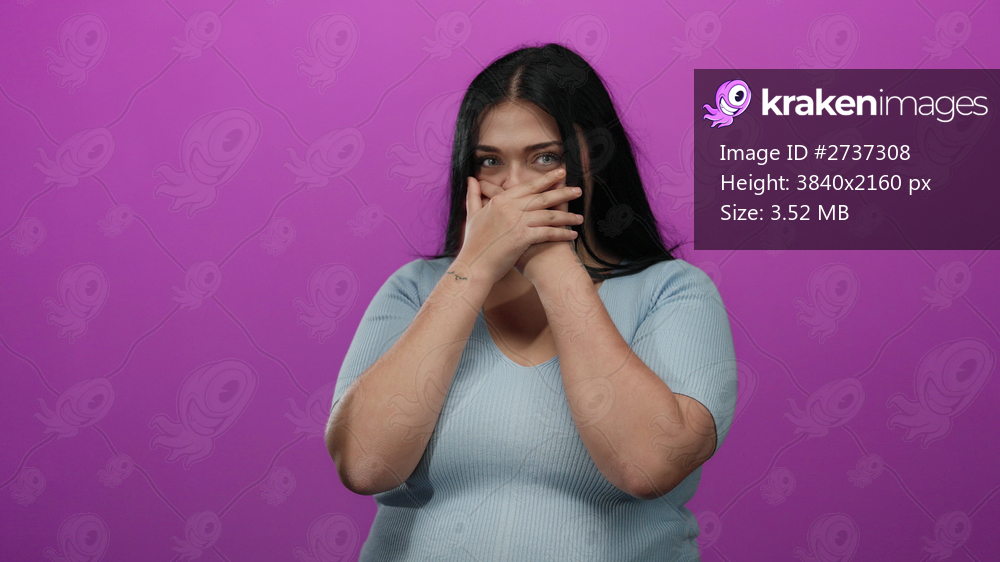 Woman covers mouth with hands standing against pink background, expressing surprise, wearing blue shirt, conveying emotion, featuring young plus-size woman, isolated in vibrant setting.