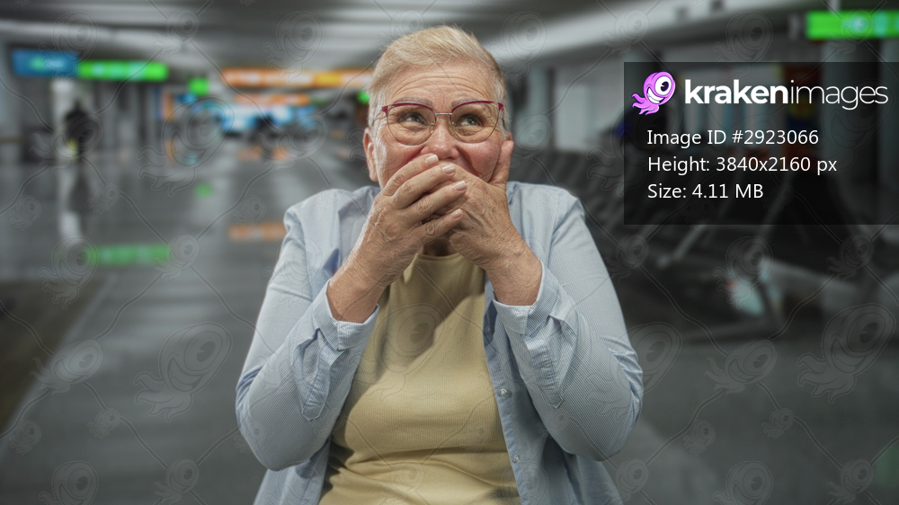 Woman covers mouth with hands while sitting in an airport terminal near rows of empty chairs and departure signage; surprise travel memory.