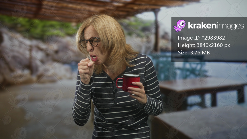 Woman covers mouth yawning while holding a red coffee mug and touching her forehead at a seaside table inside a building; fatigue morning.