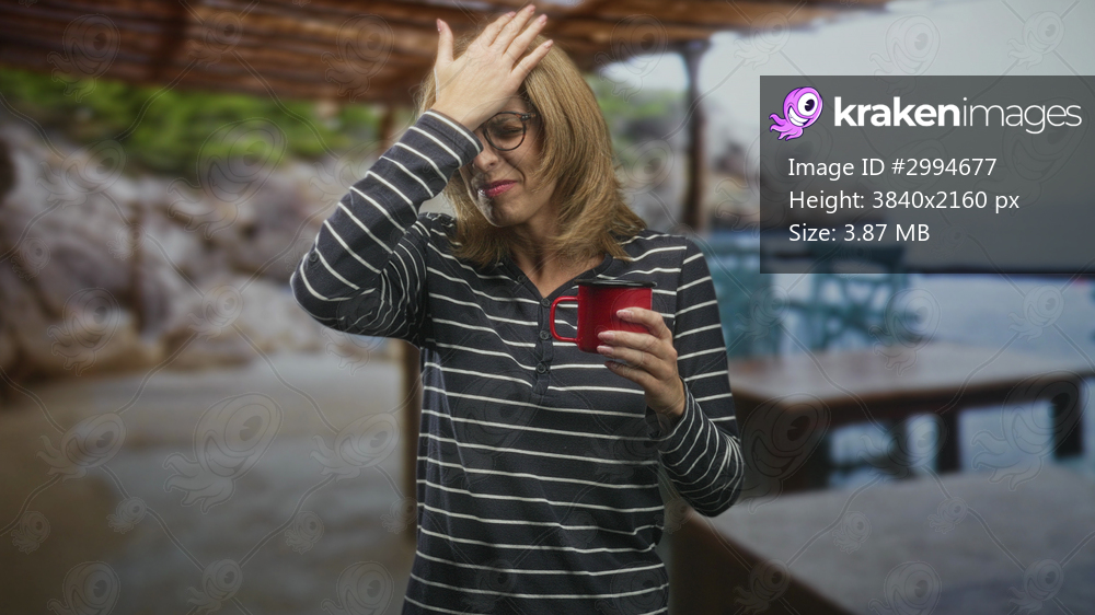 Woman covers mouth yawning while holding a red coffee mug and touching her forehead at a seaside table inside a building; fatigue morning.