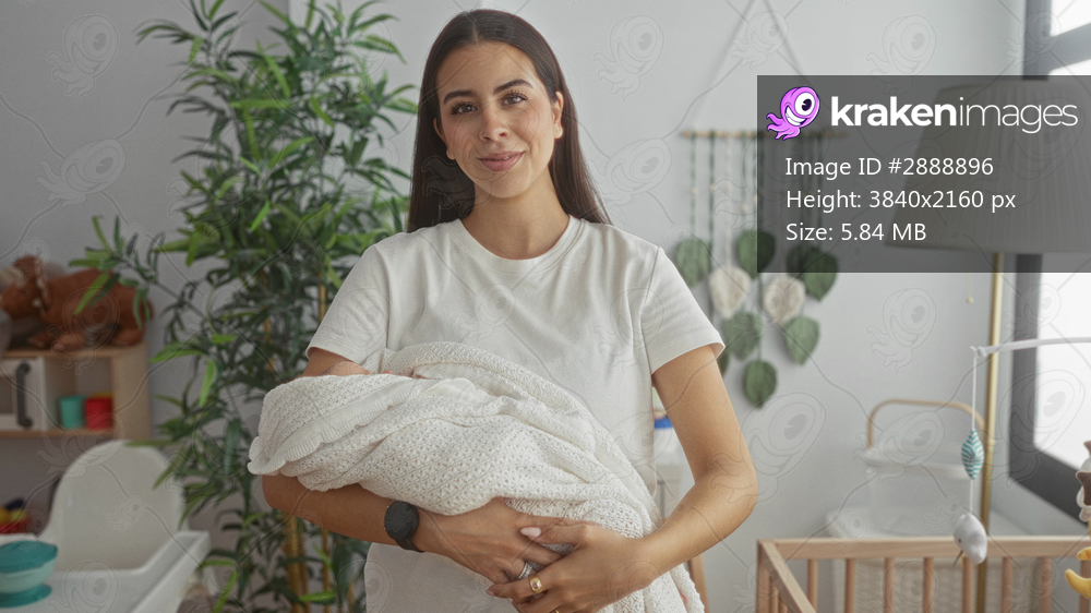 Woman cradling swaddled baby with hands supporting head and body in studio bedroom; motherhood serenity.