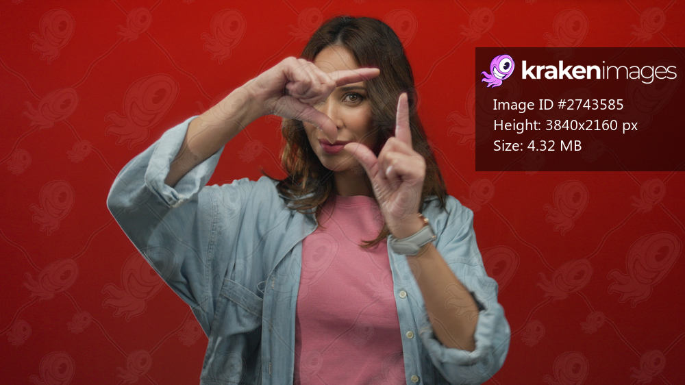 Woman creating frame with hands in front of vibrant red backdrop wearing casual denim and pink attire, exuding creativity and focus with a confident, thoughtful expression. - Kraken Images