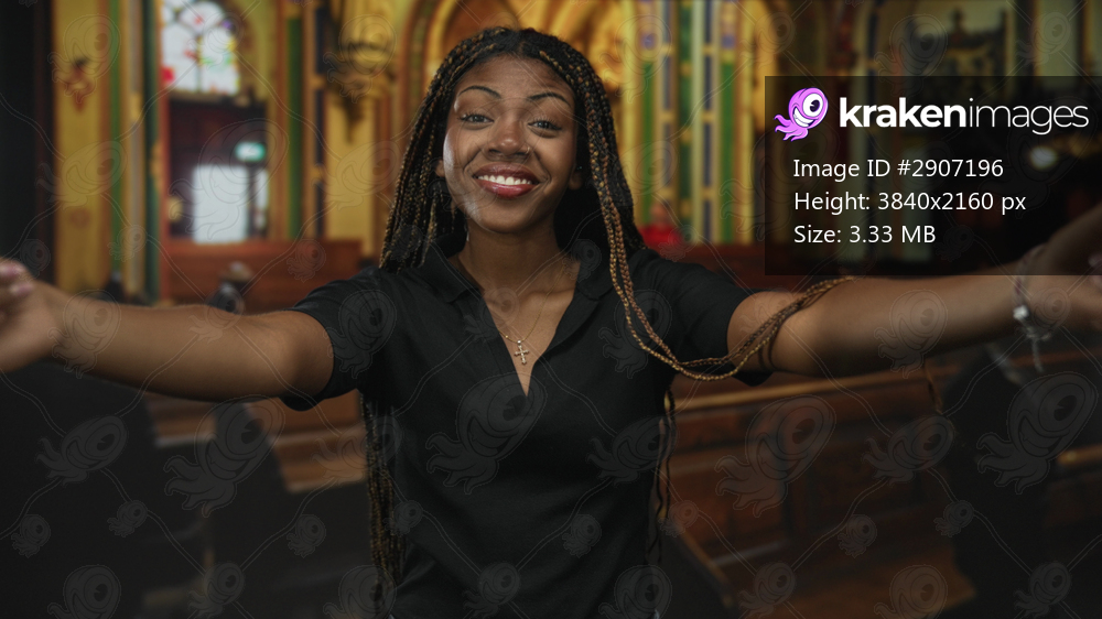 Woman with cross necklace and arms outstretched in church nave, smiling and reaching forward; joy faith welcome.