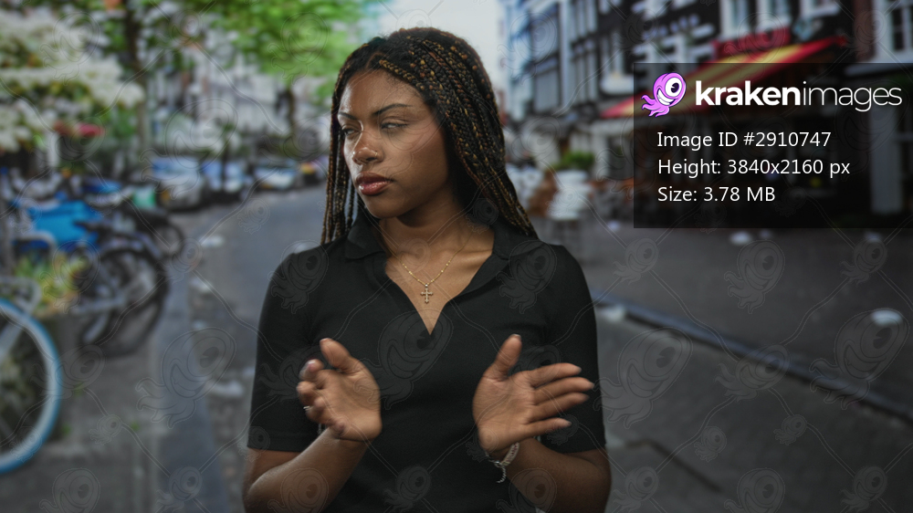 Woman with cross pendant and braided hair wearing black polo looking up on street by cafe and bicycles; contemplation.