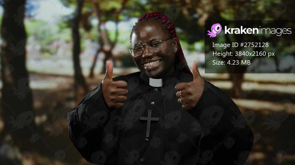 Woman with cross smiling and giving thumbs up in park setting, wearing glasses and black robe, conveying positive outdoor vibe in natural surroundings. - Kraken Images