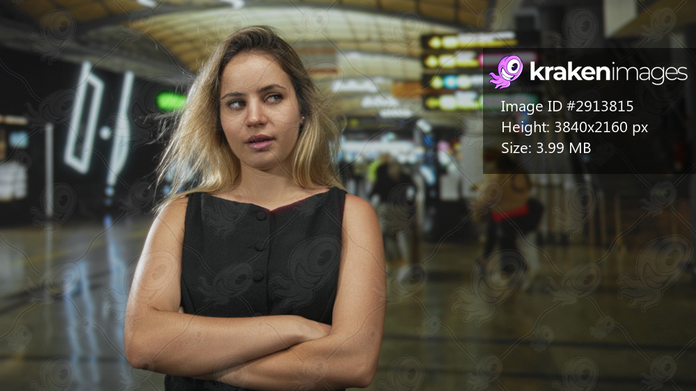 Woman with crossed arms at airport terminal wearing black dress, blonde hair visible, passengers and signs blurred behind her; travel frustration.