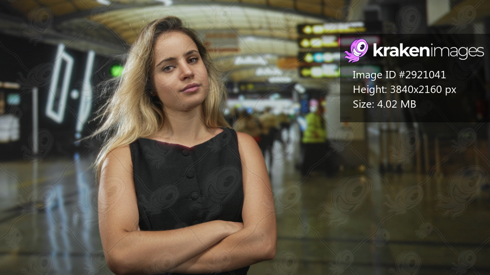 Woman with crossed arms at airport terminal wearing black dress, blonde hair visible, passengers and signs blurred behind her; travel frustration.