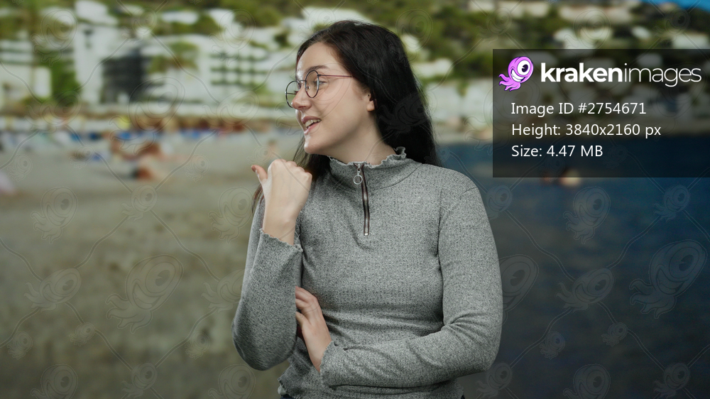 Woman with crossed arms and brunette hair wearing glasses looks sideways at a bustling beach with sea and buildings in the background on a sunny day.