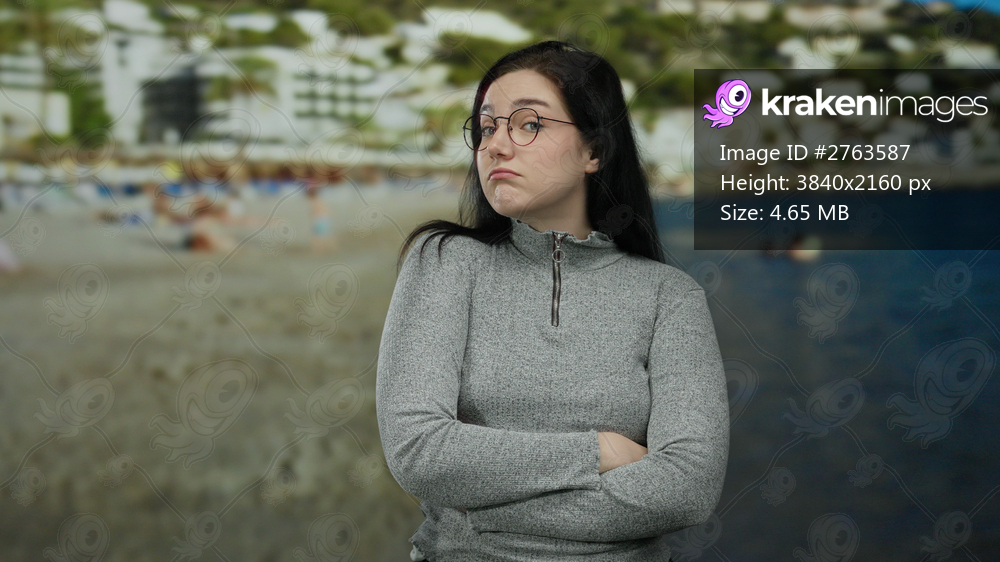 Woman with crossed arms and brunette hair wearing glasses looks sideways at a bustling beach with sea and buildings in the background on a sunny day.