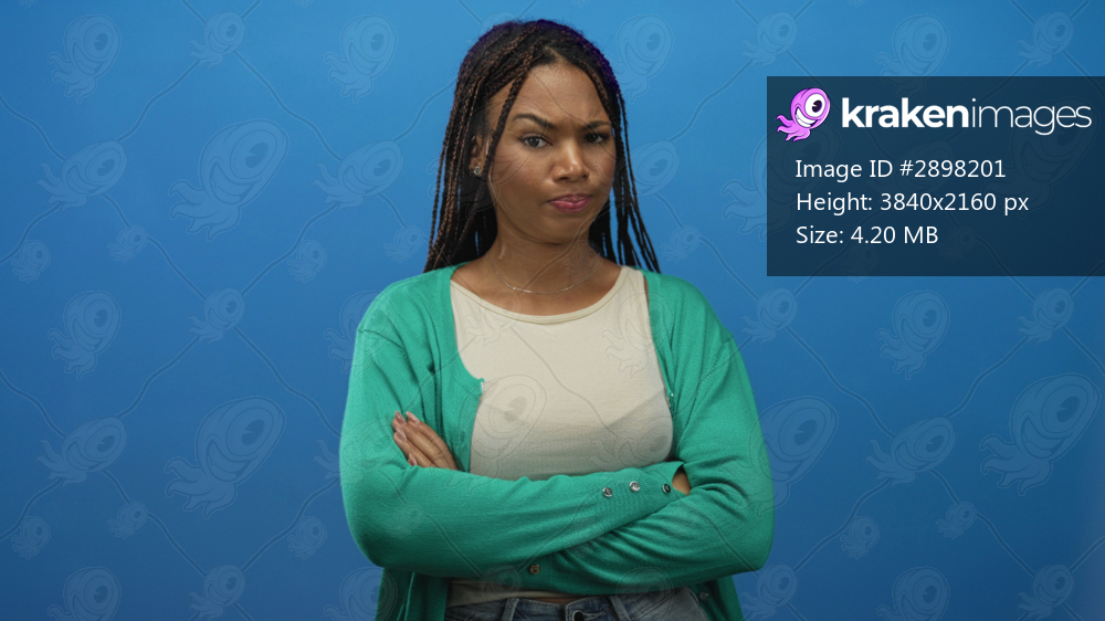 Woman with crossed arms and direct stare, wearing green cardigan and beige top with braided hair in bright blue studio; disapproval determination.