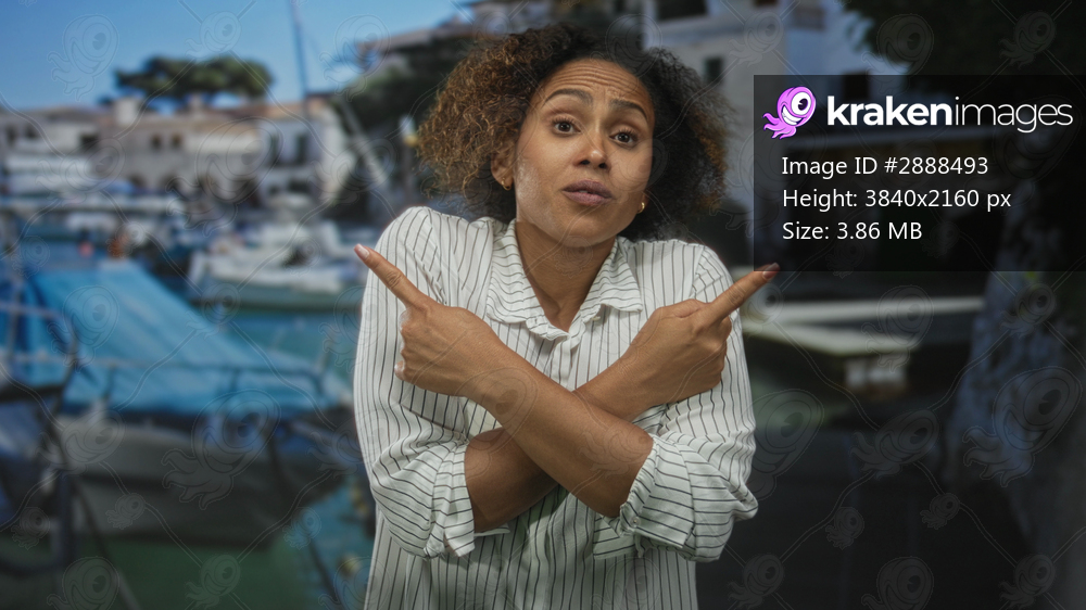 Woman with crossed arms and fingers pointing to opposite sides on a street beside a port and boats at the seaside; uncertainty choice direction.