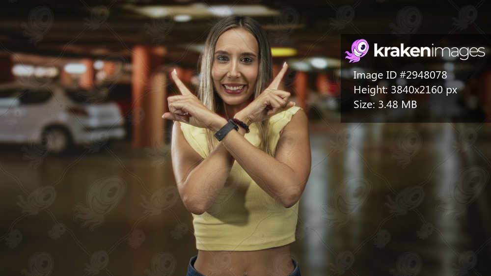 Woman with crossed arms forming an x and pointing index fingers in a parking building among cars; rejection defiance.