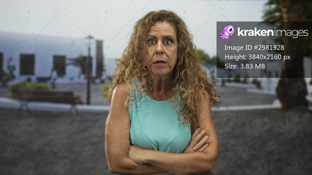 Woman with crossed arms and furrowed brow in turquoise sleeveless top, later pointing finger and glaring while standing on a cobblestone street near a bench and lamp post, curly hair; frustration. - Kraken Images