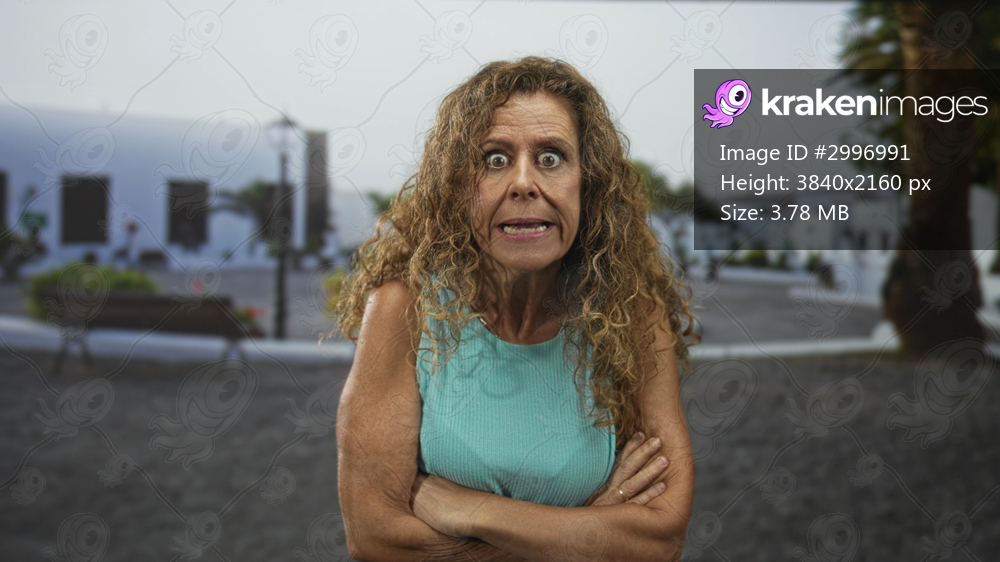 Woman with crossed arms and furrowed brow in turquoise sleeveless top, later pointing finger and glaring while standing on a cobblestone street near a bench and lamp post, curly hair; frustration. - Kraken Images