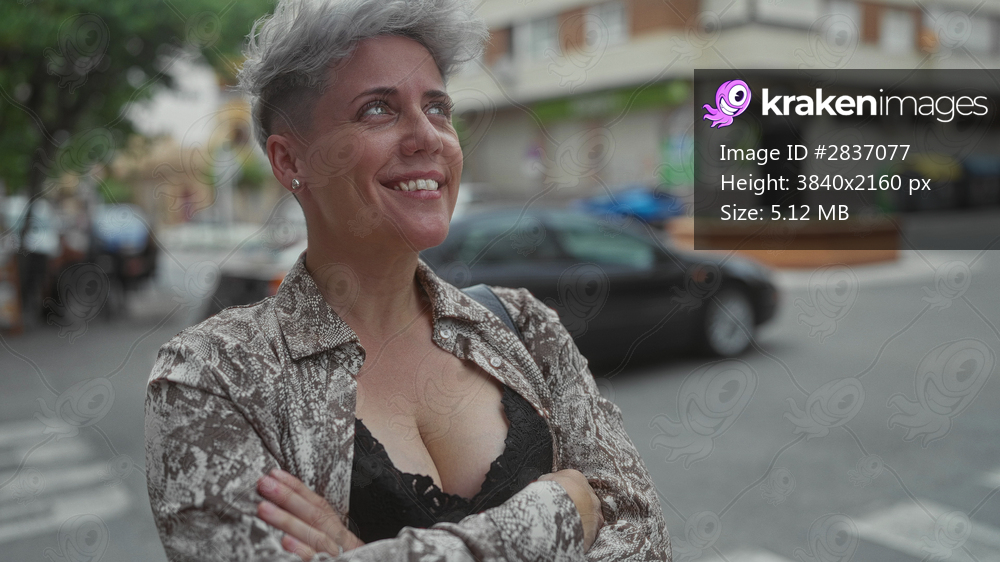 Woman with crossed arms gesture showing bare cleavage and silver earrings on urban street crossing zebra line; confidence.