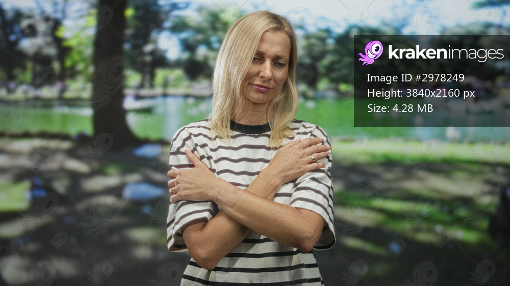 Woman with crossed arms and hands on shoulders, wearing striped shirt and visible ring, pensive expression in studio; sadness reflection.
