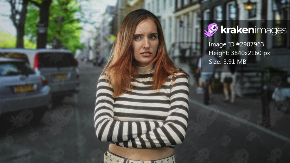 Woman with crossed arms in striped crop top showing midriff on street with parked cars and row buildings; annoyance defiance.