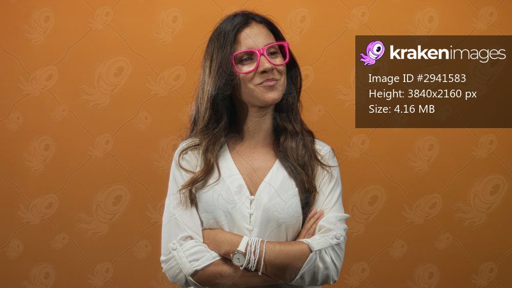 Woman with crossed arms, pink glasses, white blouse and visible forearms posed in an orange studio setting; confidence.
