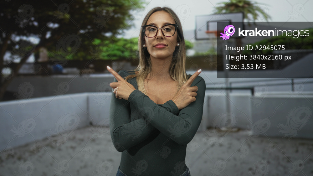 Woman with crossed arms pointing fingers on street near outdoor basketball court wearing glasses and long blonde hair; confidence choice determination. - Kraken Images