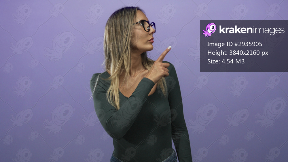 Woman with crossed arms pointing fingers to each side, wearing glasses and long hair, visible hands and neckline in a purple studio; confidence decision. - Kraken Images