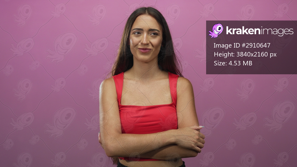 Woman with crossed arms and thumb pointing, bare shoulders and red top in pink studio; confidence casual attitude.