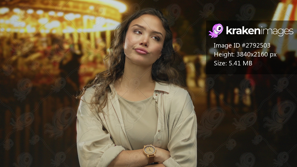 Woman with crossed arms under bright carousel lights at a crowded outdoor fair at night; rejection.