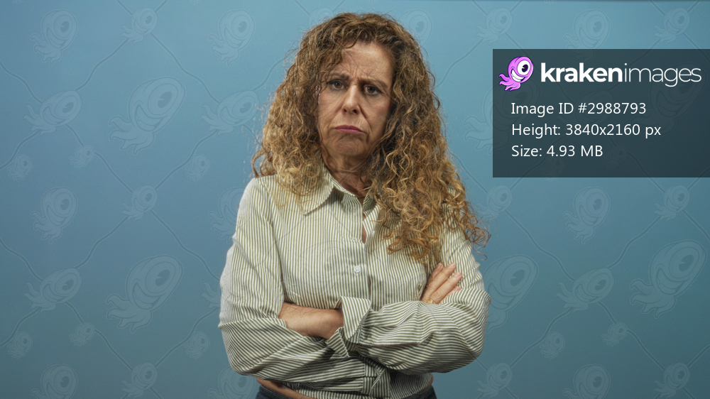 Woman with crossed arms and visible hands frowning in a studio portrait with blue backdrop; displeasure sternness.